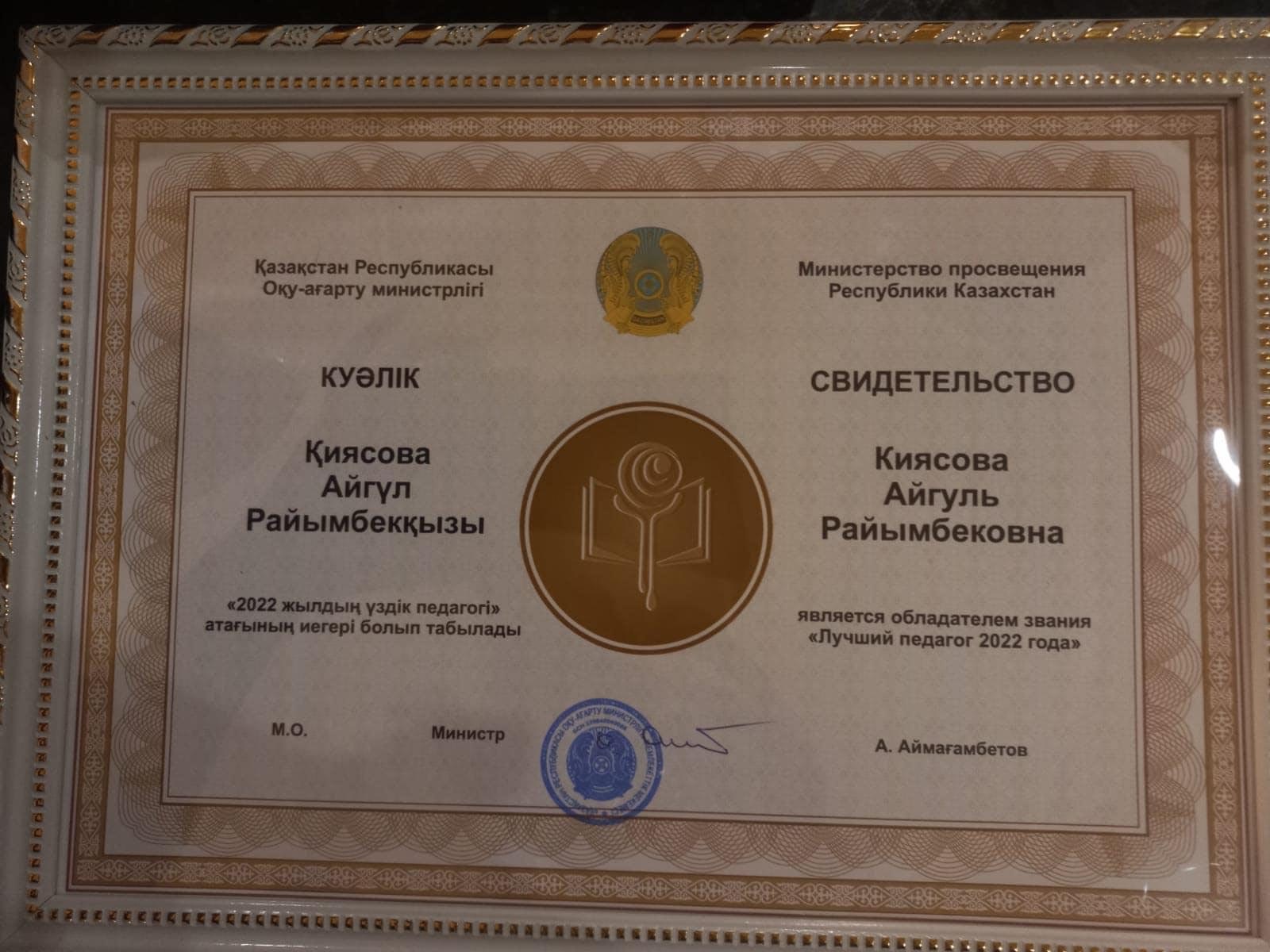 Аталған салтанатты іс-шарада мектептер мен колледждердің үздік мұғалімдеріне ақшалай сертификаттар мен төсбелгілерді Оқу-ағарту министрі Асхат Аймағамбетов табыс етті. Байқаудың республикалық кезеңінде «Үздік педагог-2022» атағына 123 мұғалім үміткер болды.Олар байқауға қатысушы 5,5 мың педагогтің арасынан іріктеліп алынды. Конкурс қорытындысы бойынша 64 жеңімпаз анықталды. Бабы мен бағы қатар келген ұлағатты ұстаз, Ж. Қизатов атындағы №23 мектеп-лицейдің биология пәні мұғалімі Киясова Айгүл Райымбекқызы топ жарып,жеңімпаз атанды. Өз ісінің майталман маманы,«Ұстаз»-деген ардақты аттың иегері Киясова Айгүл Райымбекқызы «Үздік педагог» атағына лайықты тұлға.Айгүл Райымбекқызын жеңісімен шын жүректен құттықтай отырып, шығармашылық шабыт,толағай табыс тілейміз.Қызылорда облысының, Қызылорда қаласының және өзінің еңбек еткен білім ордасының абыройын асқақтататын ұстаздар қатары көбейе берсін!!!
